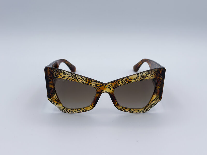 Occhiali da sole Etro della linea Etromania • Codice colore 086/HA (Havana) • Front in acetato havana con riflessi gialli e decoro Paisley nero • Aste in acetato havana con riflessi gialli, pegaso con contorno rifinito in oro e decoro Paisley nero • Calibro 55 • Ponte 20